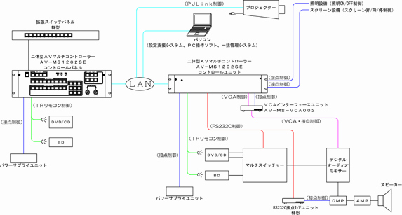 また、複数台のAVマルチコントローラーを1台のAVマルチコントローラーで遠隔操作することが可能なため、テレビ会議・遠隔講義や部屋の合同利用など、ひとつの部屋から複数の部屋を一括で操作することが可能です。