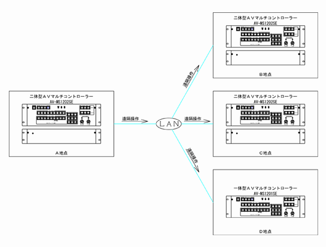 また、複数台のAVマルチコントローラーを1台のAVマルチコントローラーで遠隔操作することが可能なため、テレビ会議・遠隔講義や部屋の合同利用など、ひとつの部屋から複数の部屋を一括で操作することが可能です。